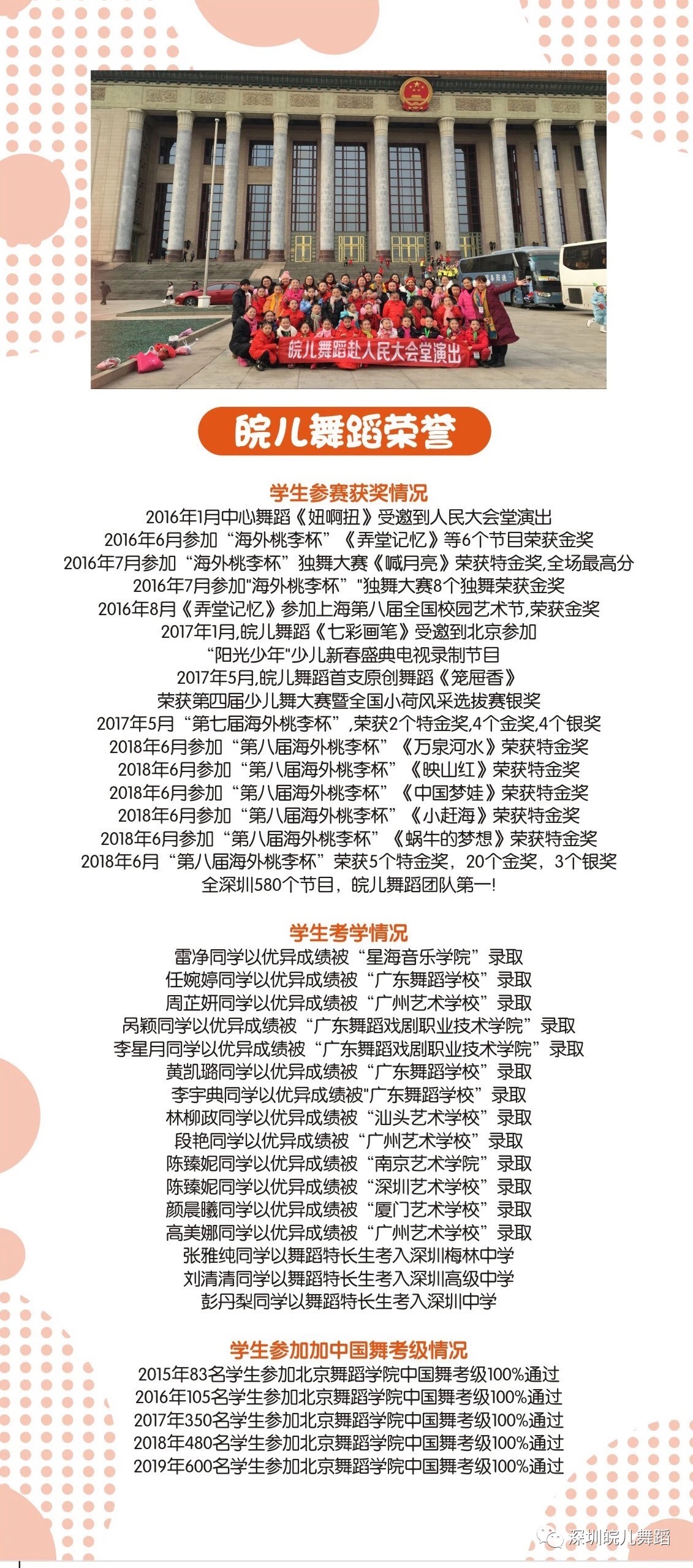 皖儿舞蹈隶属深圳市小皖艺术发展有限公司,成立于2014年,多年以来专注于少儿舞蹈培训,目前已有5家校区,教室面积达1500平。在深圳宝安少儿舞蹈培训领域位列前茅,在深圳乃至全国比赛屡获金奖,家长好评如潮。